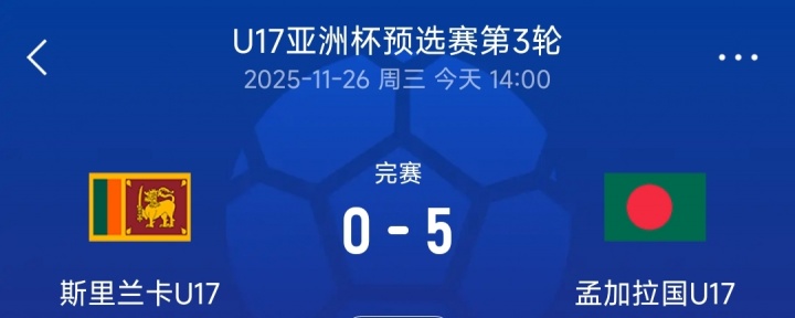 11月26日讯 今天下午结束的一场U17亚洲杯预选赛,孟加拉国5-0大胜斯里兰卡,暂升小组第一。