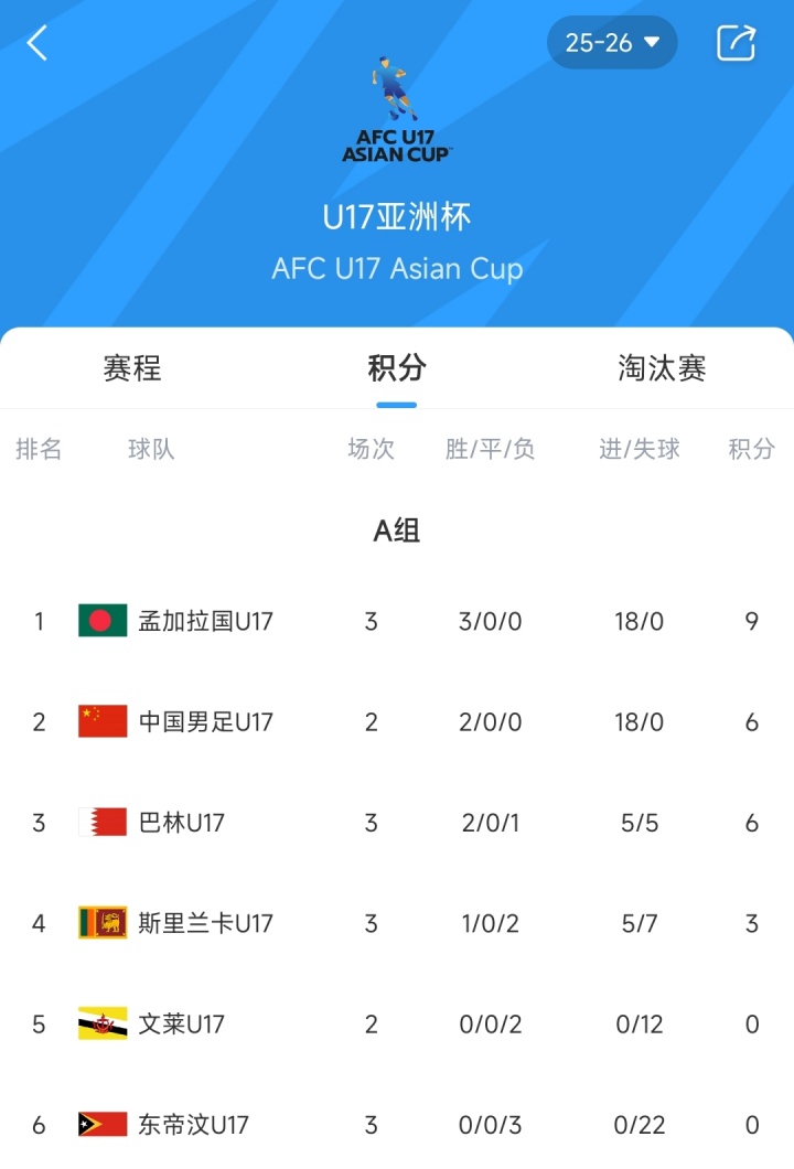 在U17亚预赛积分榜上,孟加拉国3战全胜,净胜球18个,先赛排名小组第一。中国国少目前2轮全胜净胜球同为18,今晚将迎战文莱,取胜就将重回积分榜榜首。