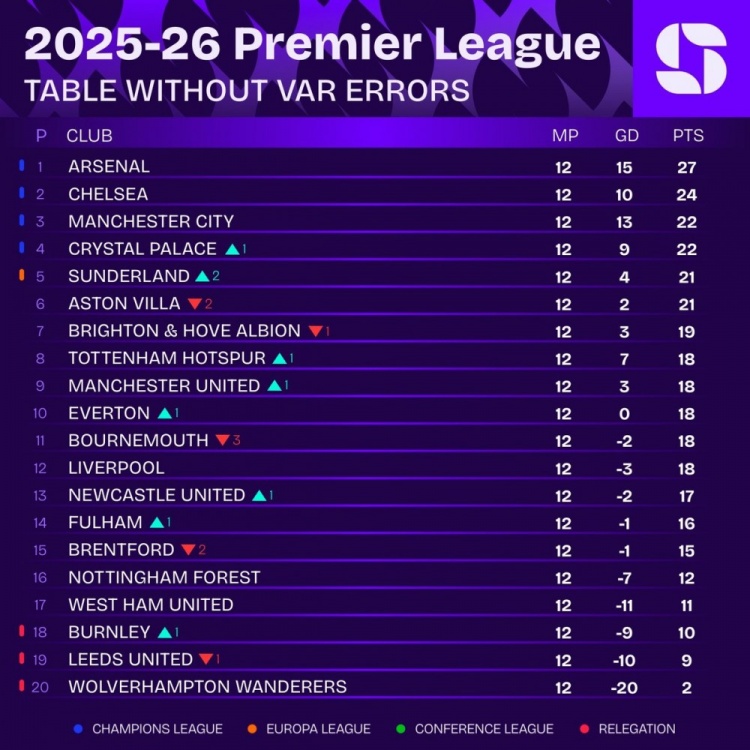 11月26日讯 数据网站Squawka票选了本赛季英超每周最具争议的VAR判罚,并列出了若无VAR误判的英超积分榜。